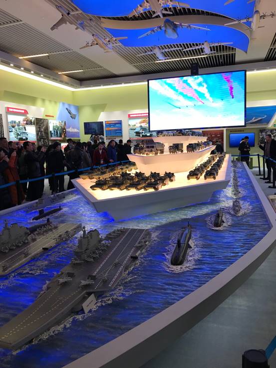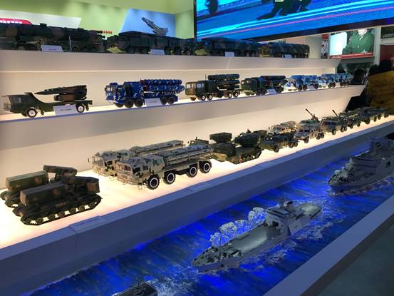 舰艇形的展台上展示了参加2017朱日和阅兵式和2018年南海阅兵式的所有武器装备的模型,如见硝烟滚滚,如闻炮声隆隆,壮我国威,壮我军威。