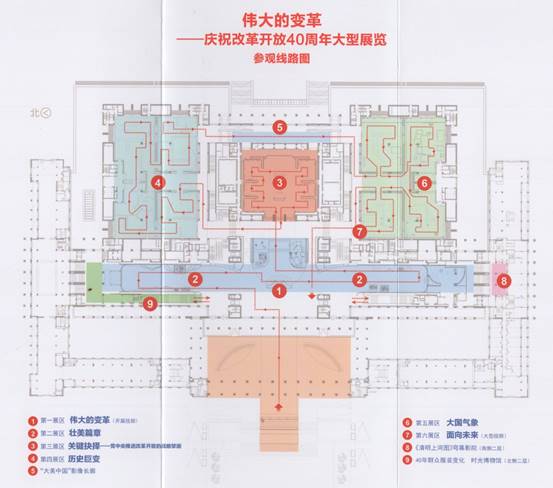 根据导览图的介绍,展览分成六个展区。每个展区运用历史图片、文字视频、实物场景、沙盘模型、互动体验等多种手段和元素,多角度、全景式地集中展示了改革开放光辉历程、伟大成就和宝贵经验,充分展示了40年来,特别是党的十八大以来,人民群众生产生活发生的伟大变迁,中华民族迎来了从站起来、富起来到强起来的伟大飞跃。