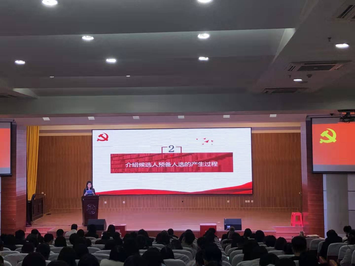 大会在雄壮的国歌声中拉开帷幕,mg4355vip线路主页检测第二届学生党总支委员周翠翠代表第二届学生党总支做了工作汇报,总结了四年工作中学生党总支在思想建设、党员发展、组织建设和党员教育培养方面取得的成绩和未来进一步前进的方向。