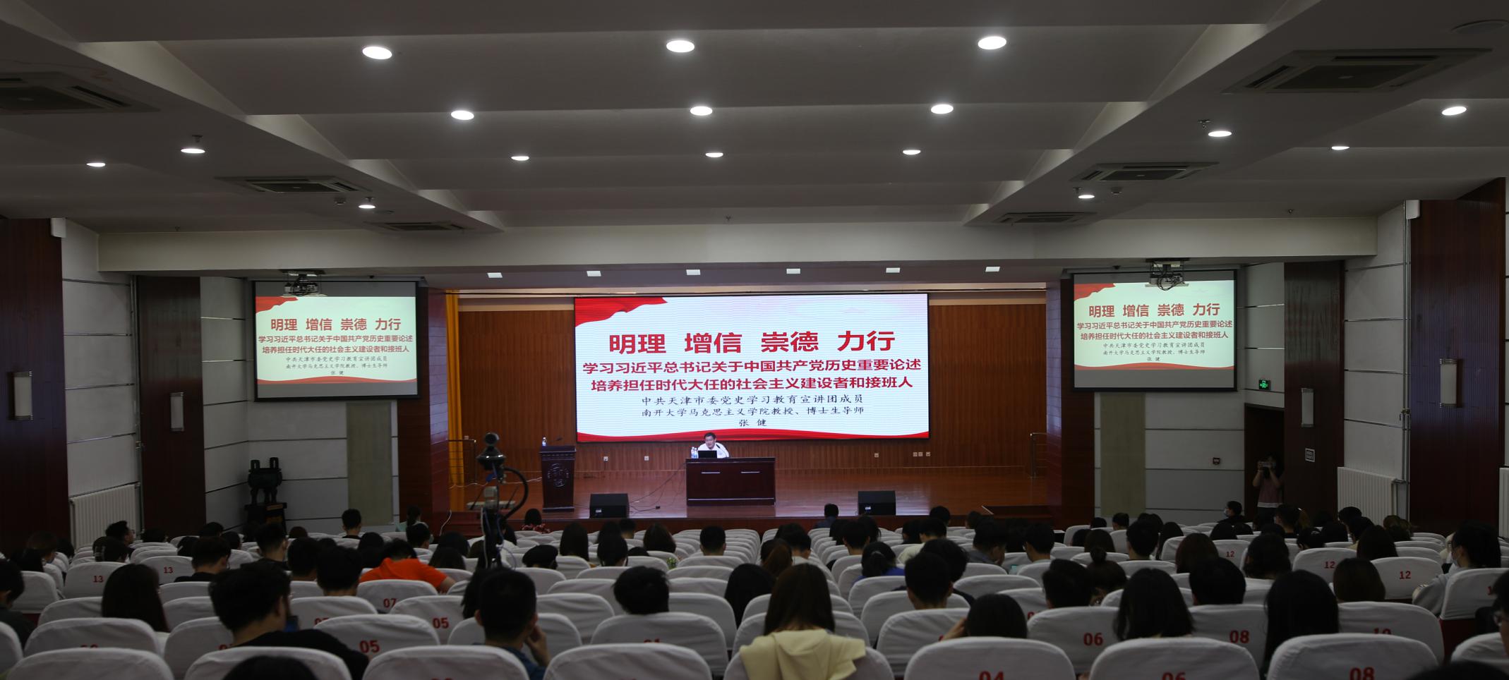 张健教授从“学习总书记重要讲话解读中国共产党历史、中国共产党能够创造世纪伟业的关键所在、树立科学历史观正确看待中国共产党历史、发扬优良学风做到学史明理增信崇德力行”四个方面进行了深刻阐释,他指出,我们党经过顽强奋斗,带领人民实现了中华民族从“东亚病夫到站起来”、实现了从“站起来到富起来”、迎来了从“站起来、富起来到强起来”的三次伟大飞跃。这一百年是矢志践行初心使命的一百年,是筚路蓝缕奠基立业的一百年,是创造辉煌开辟未来的一百年。我们回顾历史不是为了从成功中寻求慰藉,而是为了总结历史经验、把握历史规律、增强开拓前进的勇气和力量。