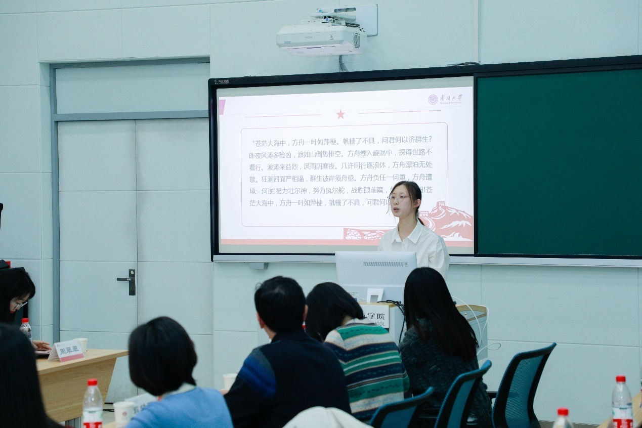 爱国主义教育不仅存在于课堂教学,也存在于实践活动中。“人间已无我,但狂澜相逼的沸海中因此多了一艘疾驰的渡人方舟。”周恩来政府管理学院东韡妍老师介绍了学生原创话剧《沸海方舟》。该剧坚持“以文化人、以德育人”,生动还原了于方舟的有血有肉、坚持信仰的革命者形象,令观众在鲜活的话剧中学习与感受先烈精神。