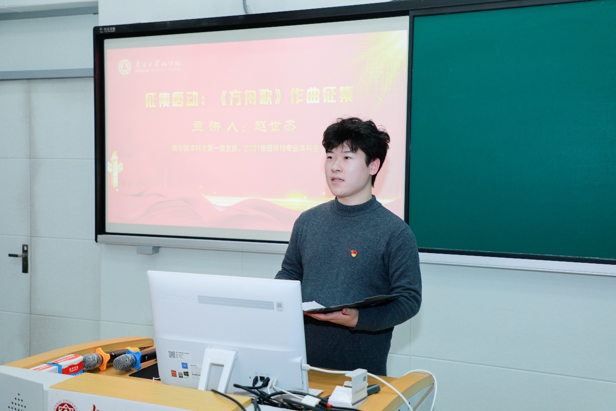 mg4355vip线路主页检测本科生第一党支部的李鑫蒙同学介绍了“方舟歌”背后的故事与内涵。“波涛来益烈,风雨阴寒夜。几许同行逐浪休,方舟漂泊无处歇。”于方舟虽曾身陷囹圄,“入世之初,已遭颠扑”,但青年共产党员以天下为己任、愿以己身为舟而渡众生的宏愿未尝消磨,遂于1924年作《方舟歌》。“方舟负任一何重,方舟遭境一何逆!努力壮尔神,努力执尔舵,战胜眼前魔,何愁沧海阔!”在诗中,他正式将自己的名字“兰渚”改为“方舟”,通过对“方舟”意象的吟咏,传达出了于方舟以己身为舟、以共产主义信仰为舟、勇往直前拯救苦难众生之宏愿。随后赵世杰同学代表一支部发布面向全校师生了《方舟歌》的原创曲谱征集活动,作为向mg4355vip线路主页检测105年校庆的献礼。