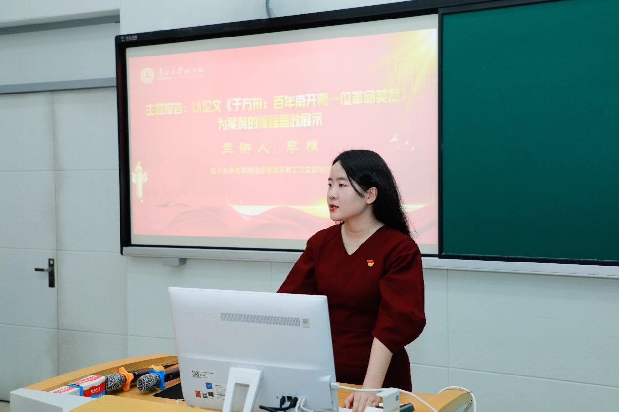 信息资源管理系教师党支部李樵老师作了“以论文《于方舟:百年南开第一位革命英烈》为案例的课程思政展示”主题报告,将于方舟烈士事迹作为期刊论文元数据著录实例,示范了如何将思政元素融入课堂教学。该门课程获得2023年度全国高校信息资源管理课程思政建设研讨会暨课程思政说课比赛、案例设计大赛特等奖。