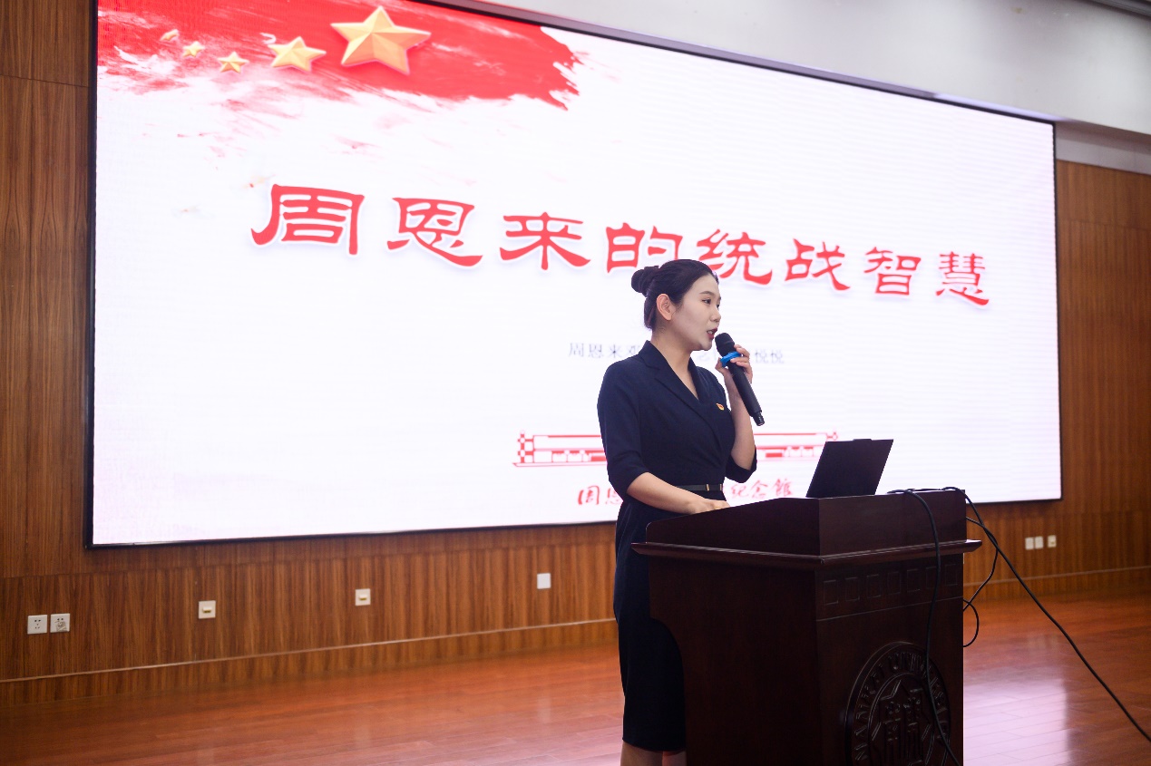 活动伊始,周恩来邓颖超纪念馆的皇悦悦老师为我们带来了题为《周恩来的统战智慧》的精彩讲座。悦悦老师运用深入的分析和丰富的资料,阐释了周恩来总理在不同历史阶段所展现的统战才能。